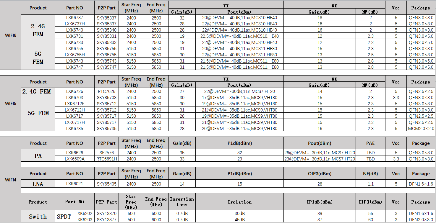 雷迅科WIFI射頻芯片,提供了基于 IEEE 802.11 N/AC/AX的各種FEM芯片,應(yīng)用于2.4G/5.8G/6G不同的路由器等設(shè)備。芯片封裝有QFN3.0*3.0,QFN2.5*2.5,MCM2.0*2.0等封裝形式。為路由器、GPON、筆記本電腦、智能手機(jī)等設(shè)備提供WIFI系統(tǒng)的射頻解決方案。